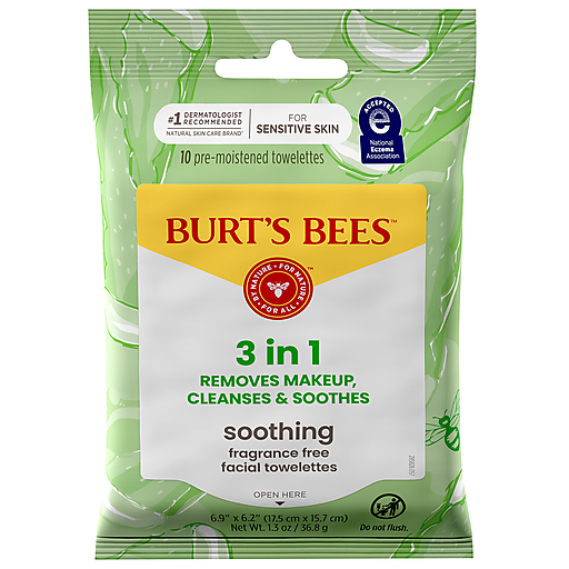 Cleanse, soothe and remove makeup from your skin using Burt's Bees Soothing Fragrance Free Facial Towelettes. These 3-in-1 facial cleanser wipes gently remove makeup, cleanse and soothe your face in one simple step. These facial cleansing wipes are formulated with aloe vera to leave skin feeling clean, fresh and soothed after every use. These makeup remover wipes are ideal for taking anywhere—whether you're at home, at the office or on the go. These 99% natural origin gentle face cleanser towelettes are Leaping Bunny Certified (never tested on animals) and formulated without parabens, phthalates, petrolatum or SLS. Simply wipe your face with the makeup remover cloths to remove dirt, oil and makeup. Pair the facial cleansing towelettes with other Burt’s Bees facial skin care products. Burt's Bees is the No. 1 dermatologist-recommended natural skin care brand (1).