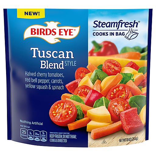 Add flavorful vegetables to your meals with Birds Eye Steamfresh Tuscan Style Blend. This delicious and vibrant frozen vegetable medley features halved cherry tomatoes, red bell peppers, yellow squash, julienne carrots and chopped spinach. These mixed veggies pair perfectly with your favorite protein to give you a tasty meal. Made with nothing artificial, this frozen vegetable blend comes in a convenient Steamfresh bag so you can enjoy perfectly steamed vegetables in just a few minutes. You can also prepare these in the skillet. Make mealtime easy and delicious by adding Birds Eye frozen vegetables to your recipes.
